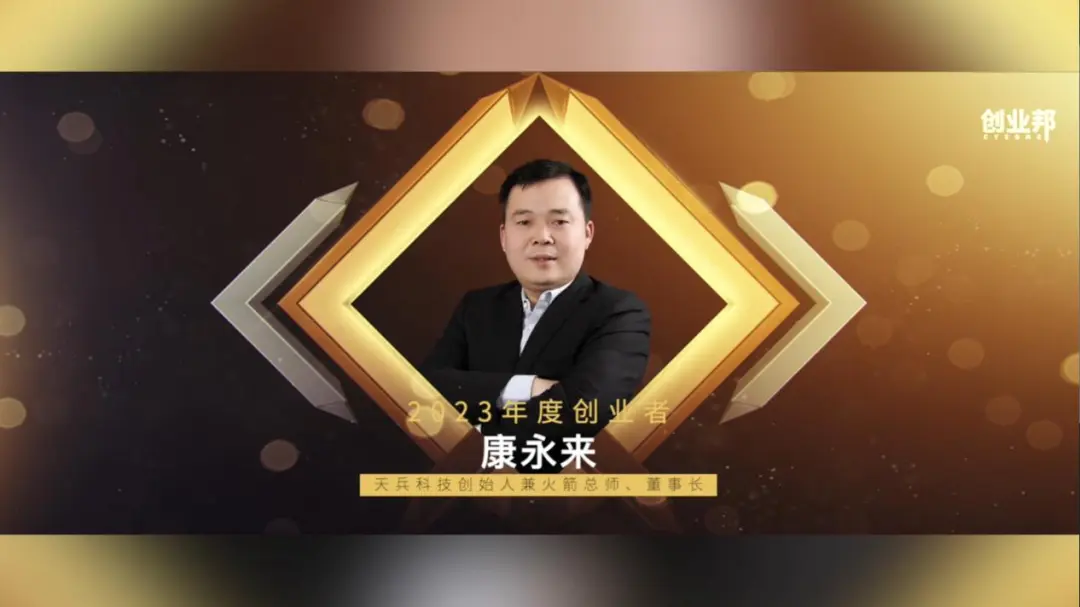 天兵科技创始人康永来先生凭借独特的国际化视野和前沿洞察力,卓越的创新实力和迅猛的发展效率,荣获创业邦 “2023年度创业者”奖项,成为该奖项成立以来第一家入围的商业航天企业。